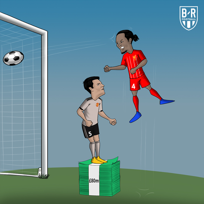 Ảnh biếm họa về pha không chiến thất bại của Maguire trước Van Dijk - Ảnh: BR Football